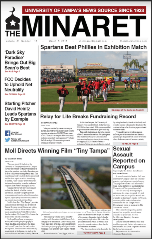 The next year, I became the sports editor, where I used Adobe InDesign to edit the layout for the weekly publication. Below, you will find two stories I wrote and a front-page design I worked on with the editorial team. The main story of the design was when UT’s baseball team defeated the Philadelphia Phillies in 2015.