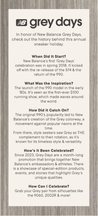 At Foot Locker, I serve on the St. Pete office culture committee. One of my responsibilities is driving awareness around New Balance Grey Days, a month-long celebration bringing attention to New Balance’s unique grey aesthetics on iconic sneakers like the 574 and 990.